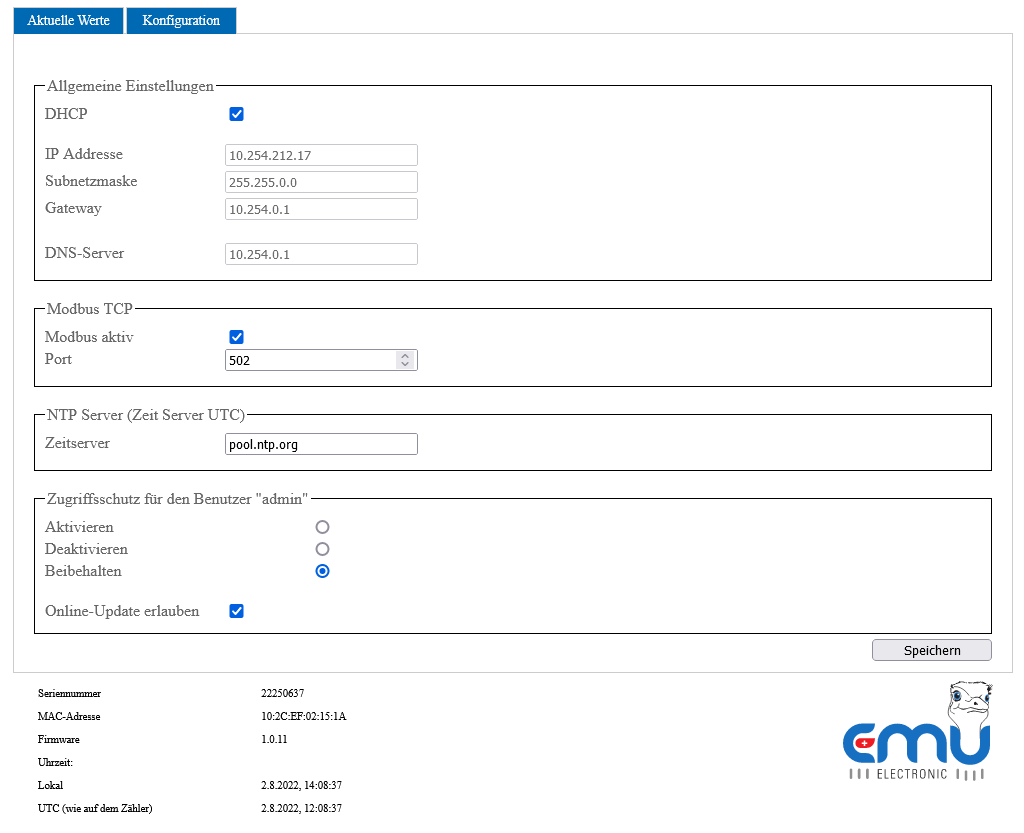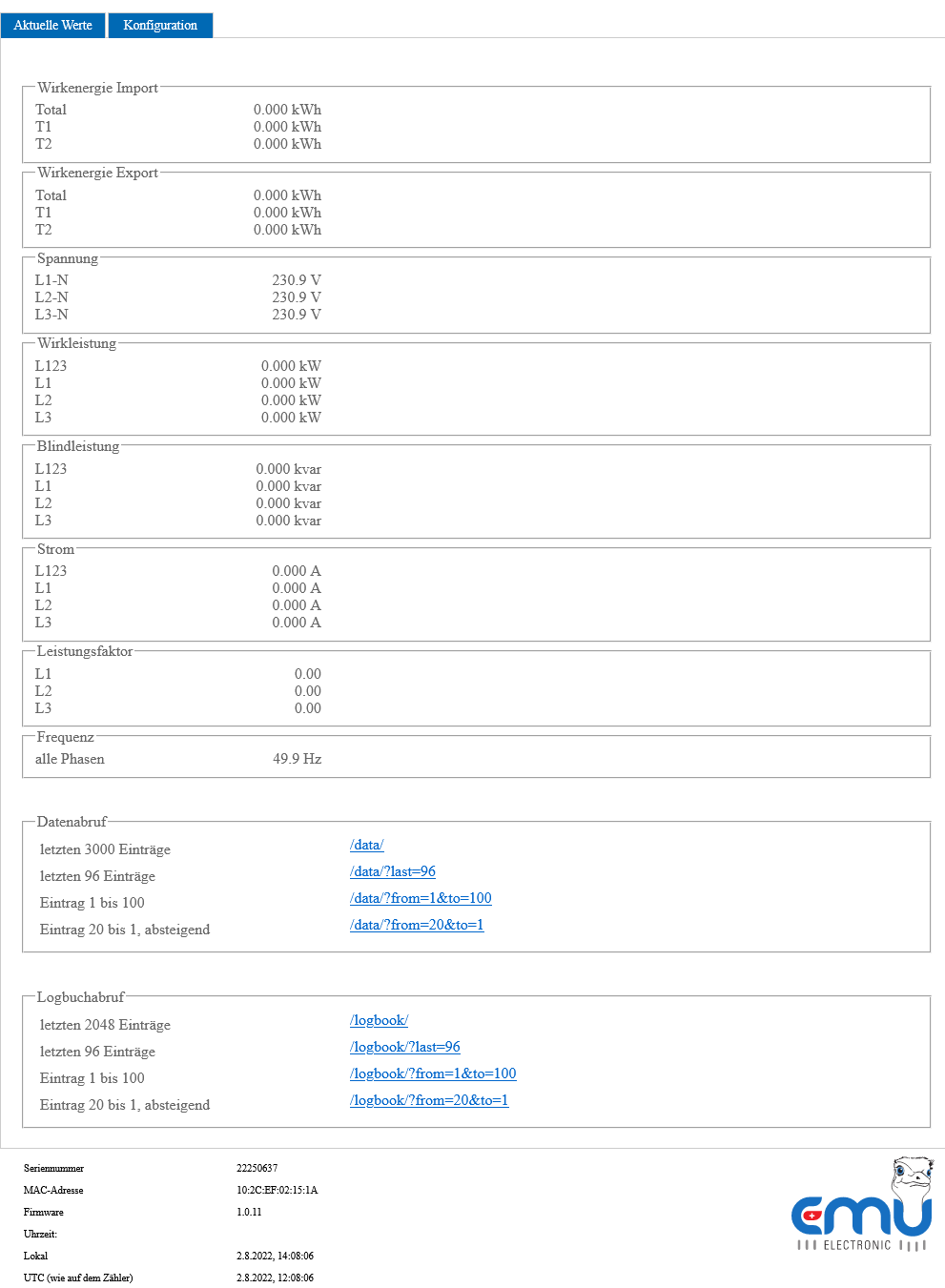 | Interface: | TCP/IP, Modbus TCP, http-get API, S0 Impulsausgang |