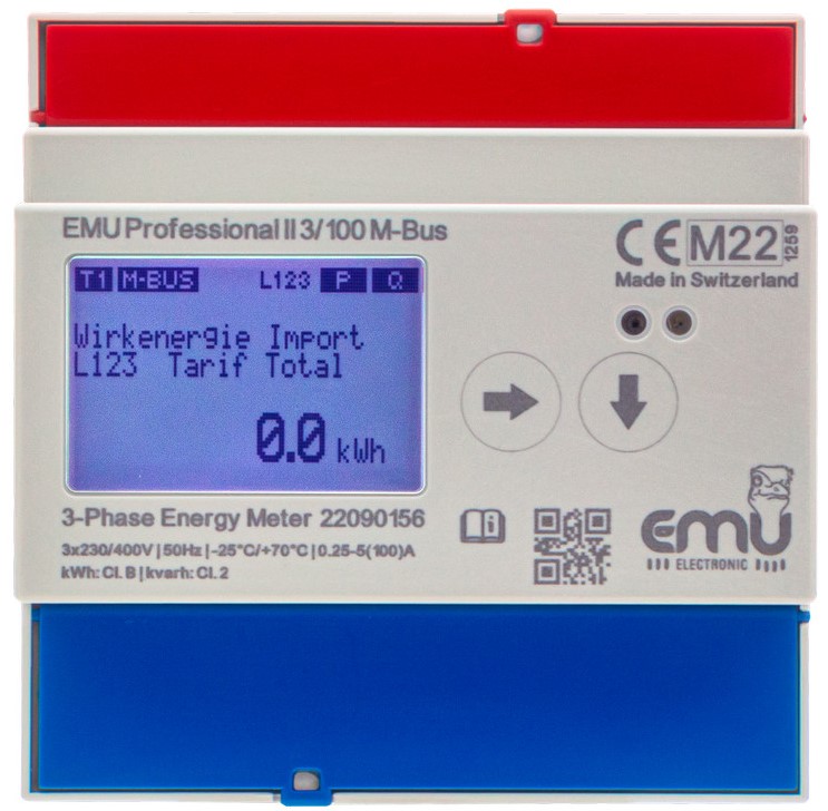 Notre compteur d'énergie triphasé EMU Professional II 3/100 M-Bus est conçu pour une connexion directe jusqu'à 100A et est livré avec la certification MID (directive sur les instruments de mesure), ce qui le rend adapté à des fins de facturation et de comptage.